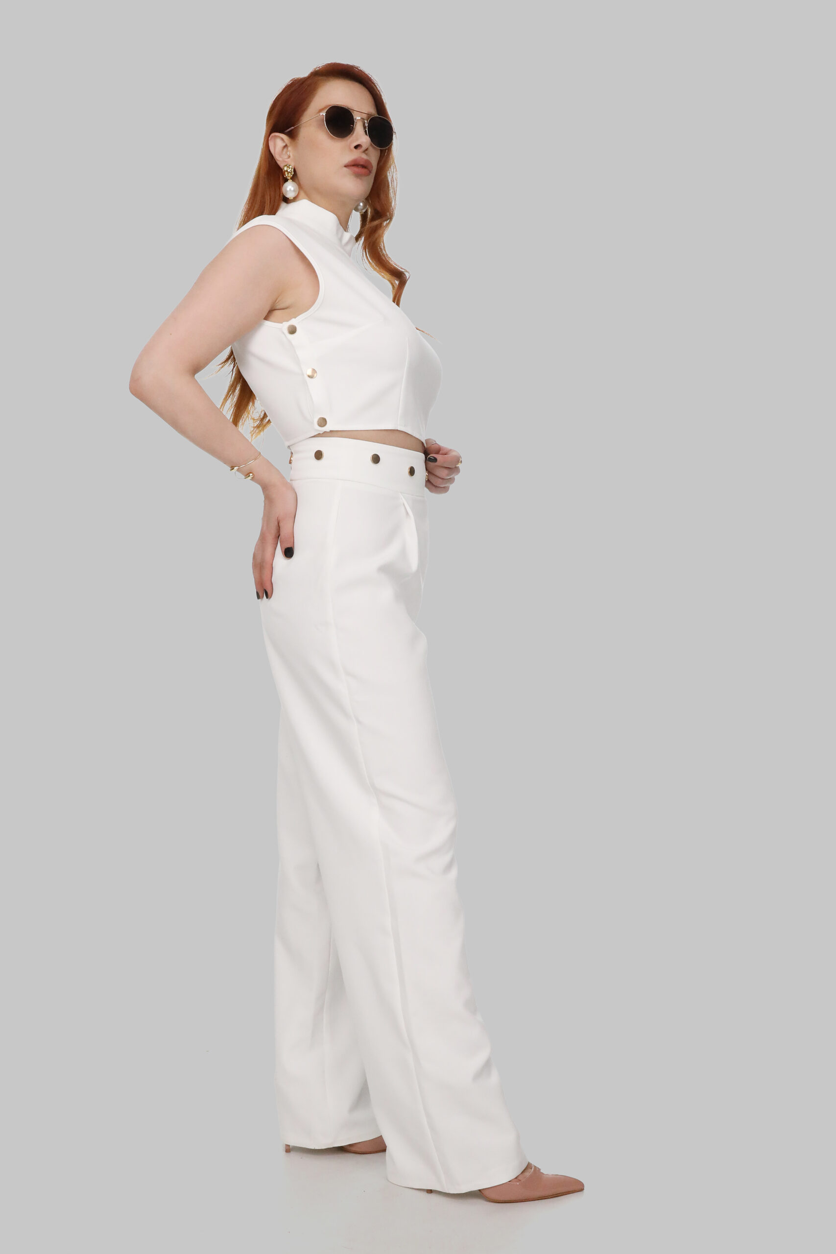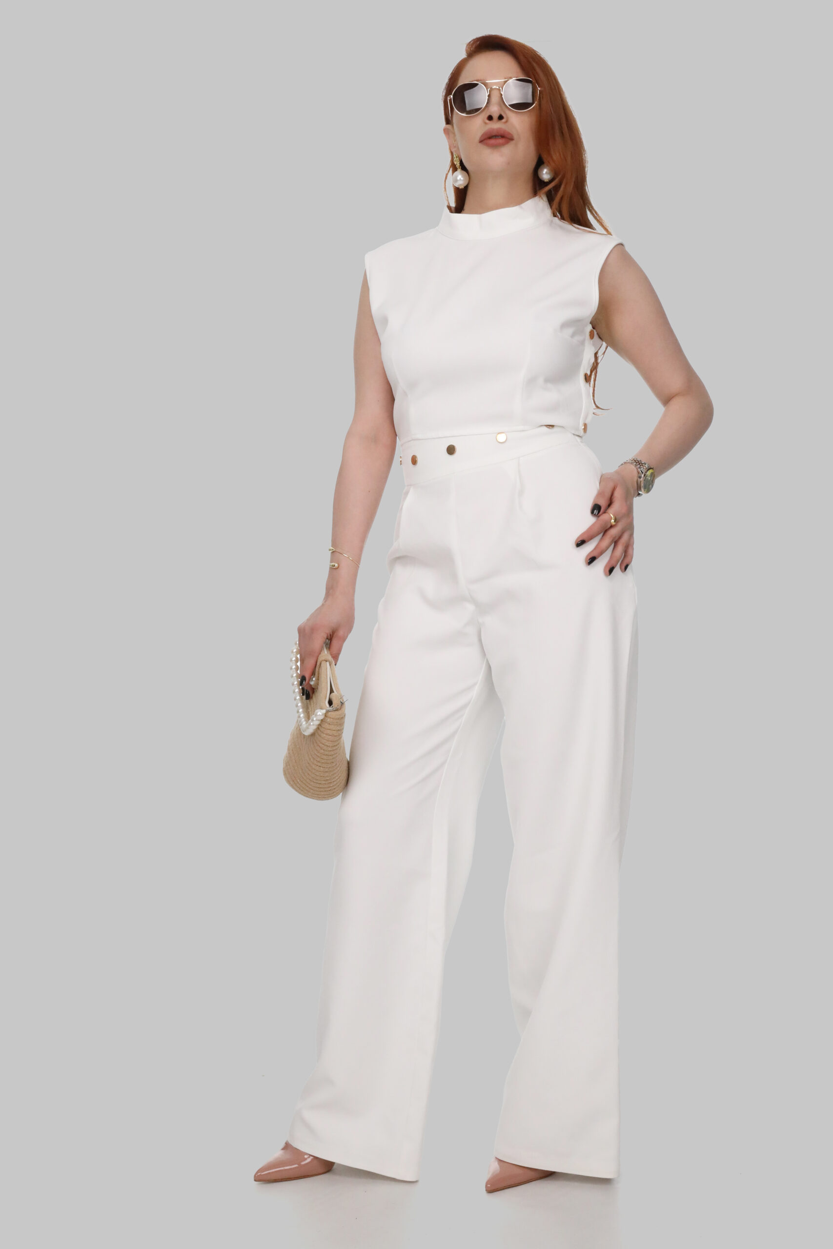 Modern ve sofistike bir stilin yansıması olan bu beyaz takım, minimal tasarımıyla zamansız bir şıklık sunuyor. Yüksek yakalı, kolsuz üst kısmı vücuda oturan zarif bir formda tasarlanırken, yan kısımdaki altın düğme detayları lüks bir dokunuş katıyor. Bel kısmındaki geniş kemer görünümü ve altın düğme aksesuarları, ince bel hattını ön plana çıkarıyor. Yüksek bel, geniş paça pantolon modeli ise hem konfor hem de uzun ve zarif bir siluet sağlıyor.
