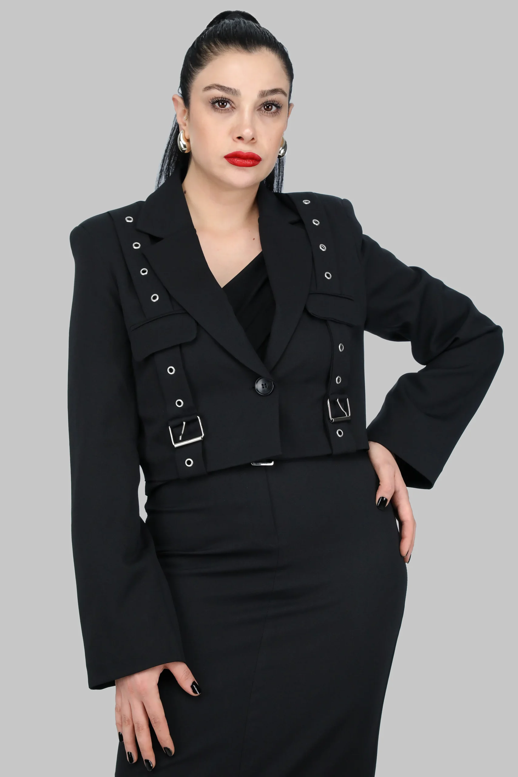 Minimal tasarımın güçlü detaylarla buluştuğu siyah tokalı kısa ceket, iddialı ve modern bir görünüm sunuyor. Metal toka ve delik detayları, klasik siyah cekete yenilikçi bir dokunuş katarken, kısa kesimi ile bel hattını ön plana çıkarıyor.