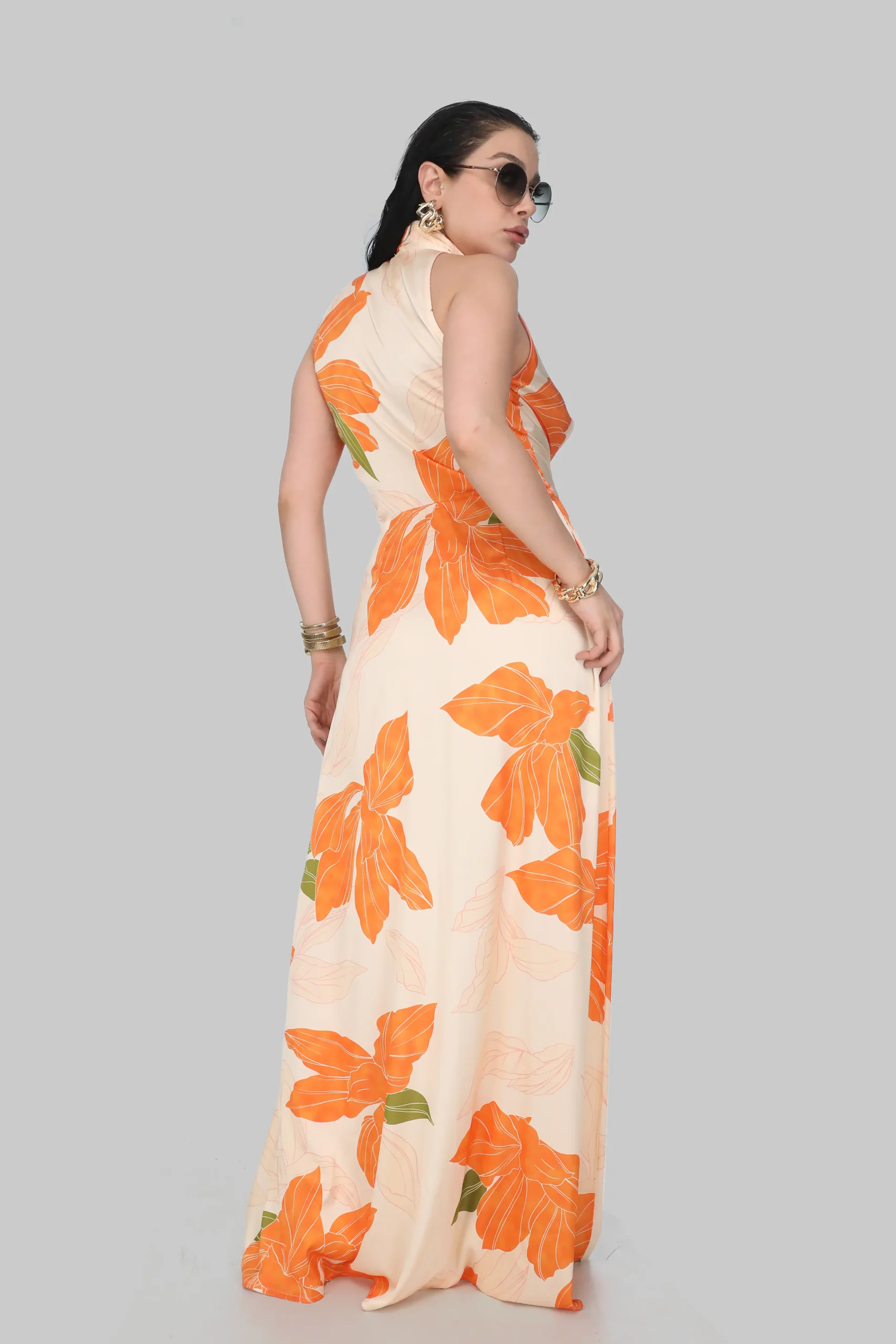 Canlı turuncu çiçek desenleri ve hafif kumaşıyla çiçek desenli uzun elbise, yaz aylarının vazgeçilmez parçalarından biri olmaya aday. Boydan boya uzanan zarif kesimi, hem gündüz hem akşam kullanımına uygun bir şıklık sunar.